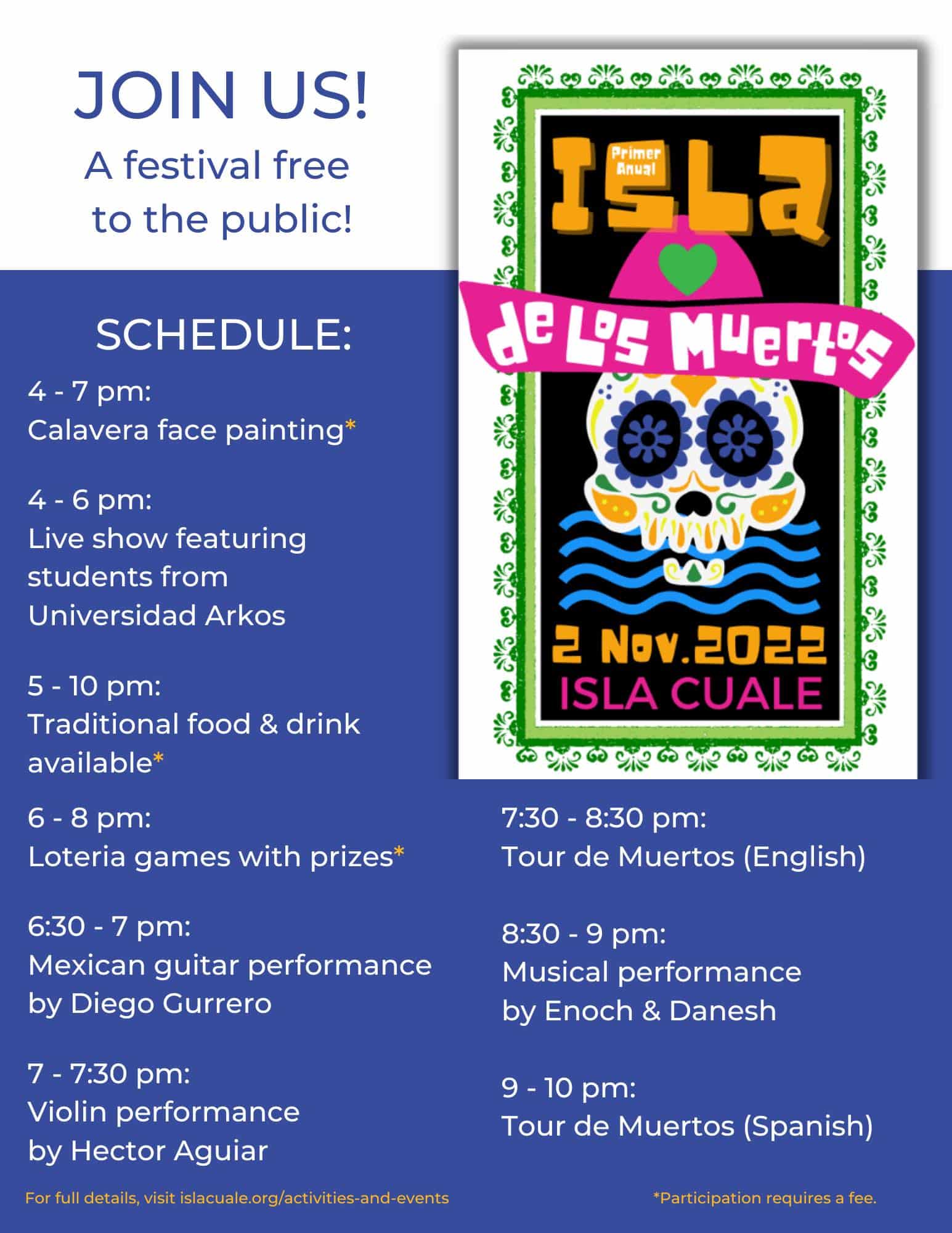 On Wednesday, November 2, Isla Cuale will be turned into an island of mystery and exciting experiences. There will be face painting, ofrendas, katrinas, loteria games, arts, special shows from the students of Universidad Arkos , music, food/drinks and “Tours de Muertos” in the Island. Admission is free.