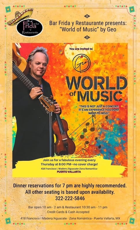 Violinist and composer Geo Uhrich will return to the Puerto Vallarta music scene this week with the launch of a new weekly concert series at Bar Frida y Restaurante.