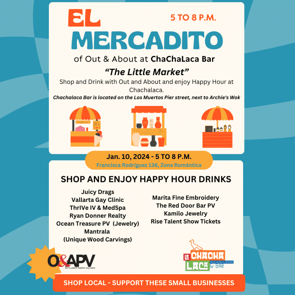 Join Out & About PV Magazine at ChaChalaca Bar on Jan 10, 2024 from 5 to 8 p.m. and enjoy shopping with these local merchants and enjoy happy hour drinks!